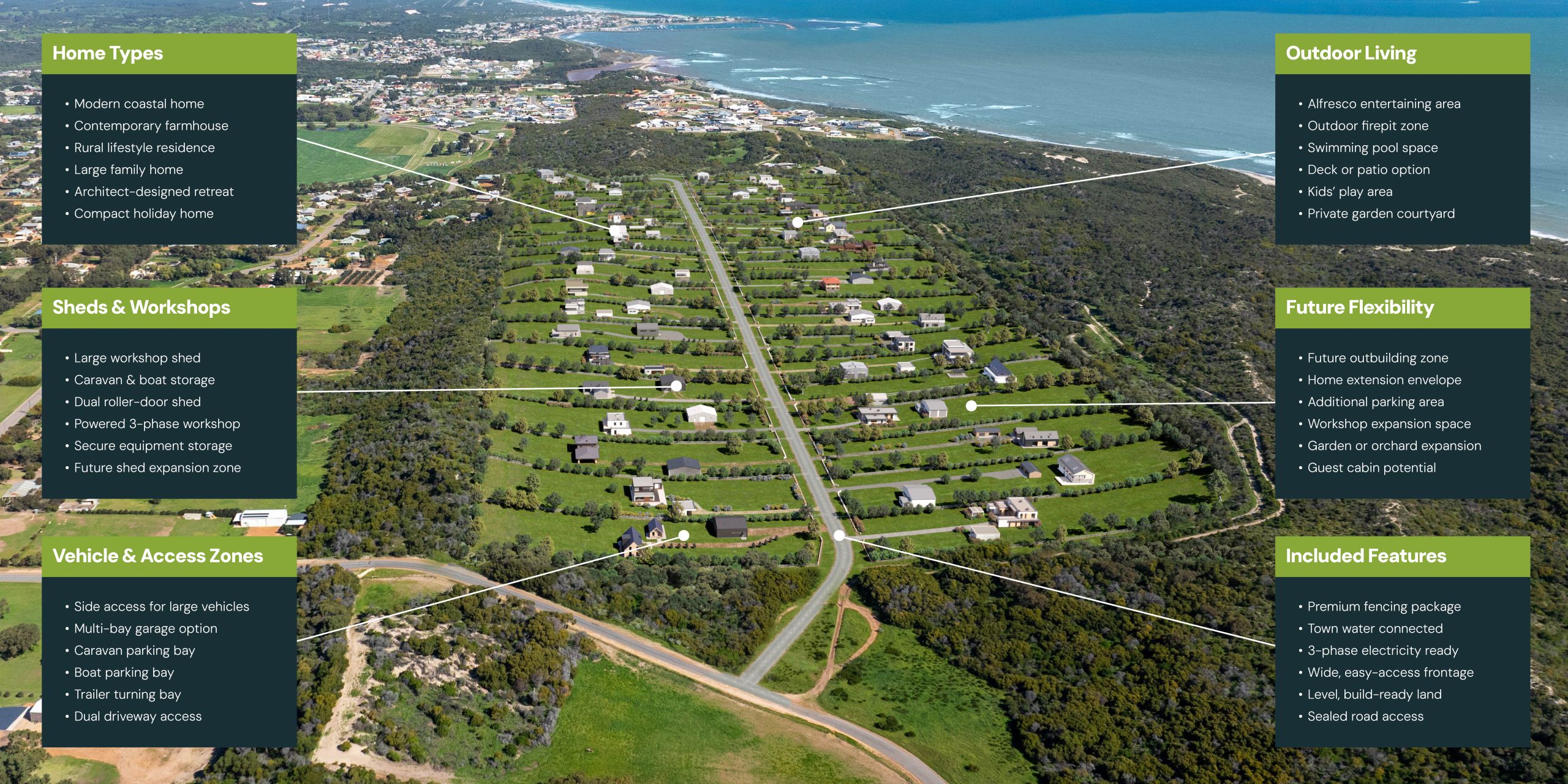 Hidden Valley Dongara gives you the flexibility to design your space without the restrictions of smaller suburban lots. With wide frontages, level land, and full services already connected, you can build the home, shed, or lifestyle layout that works for you from day one.